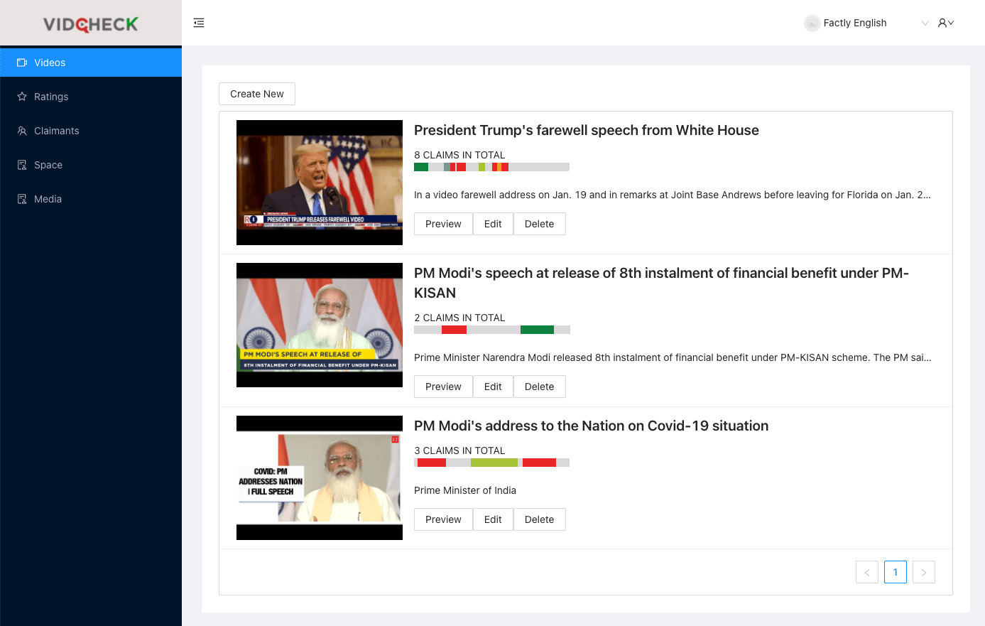 Fact-checkers need to identify the timestamps (from & to) where claims are made in the video that is to be fact-checked. They enter these timelines in VidCheck and the specific claim being made at that specific time. VidCheck then enables them to write their research, fact-check for these claims. In the case of manipulated videos or out-of-context videos, fact-checkers will identify & enter the time frames used for the purpose of evidence or clues. The relevant clip or the GIF will automatically be a part of the fact-check without having to manually embed or take screenshots. We also plan to integrate all this into the original videos so that reading the fact-check becomes a seamless exercise. Claim Review schema is populated automatically for published fact checks.